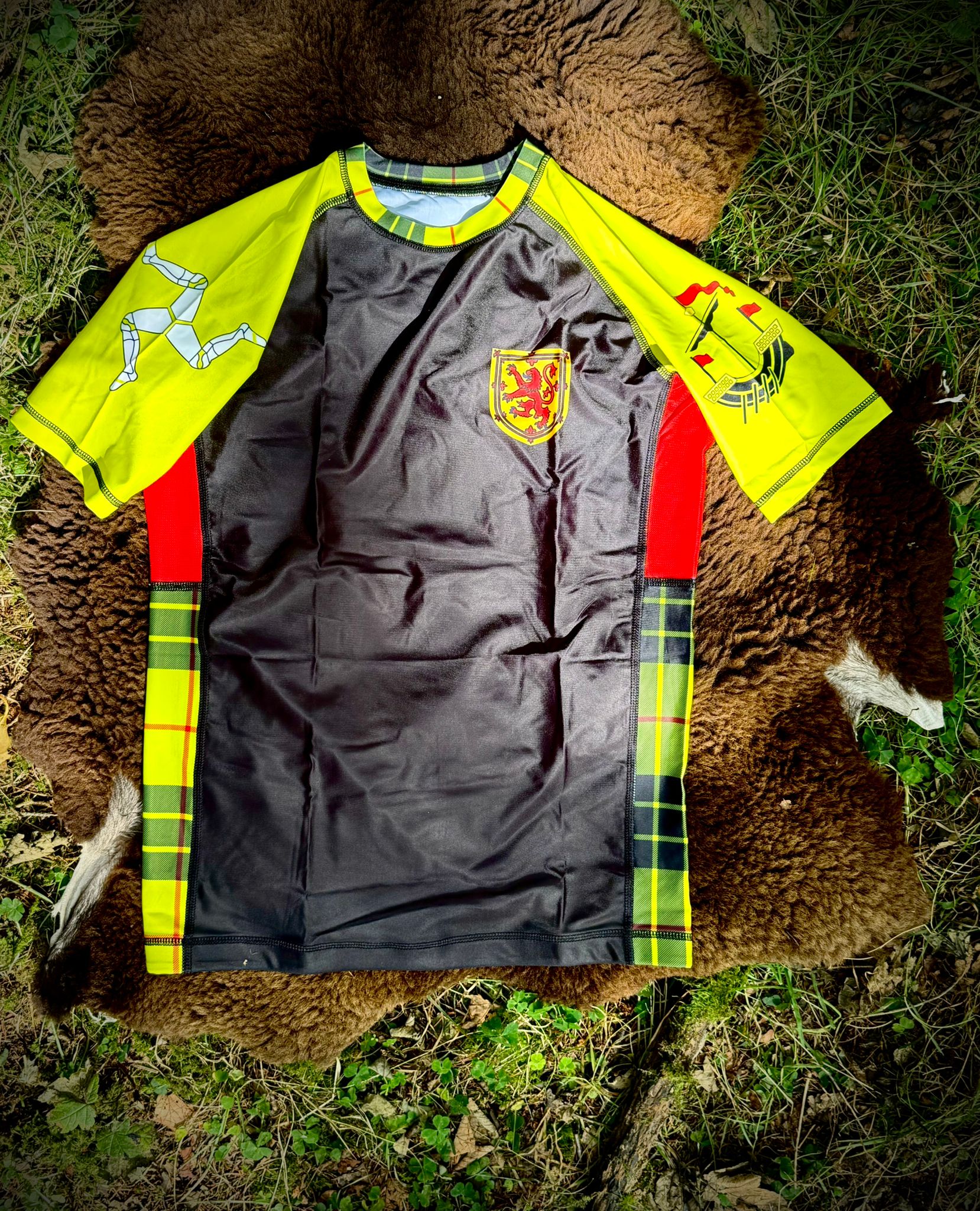 Channel the fierce seafaring heritage of the Hebrides and Orkney Isles with this bold, early medieval-inspired rashguard. Featuring the royal lion rampant of Scotland, the triskele of Mann, and Norse longships on stormy seas, this design pays tribute to the hybrid Gaelic-Norse warrior cultures of the northern isles. Bright tartan side panels evoke regional identity, while red and yellow tones bring fire to the look. Built for durability and comfort in intense training, this rashguard is a perfect fit for martial artists who fight with the spirit of the Isles—rugged, proud, and unyielding.